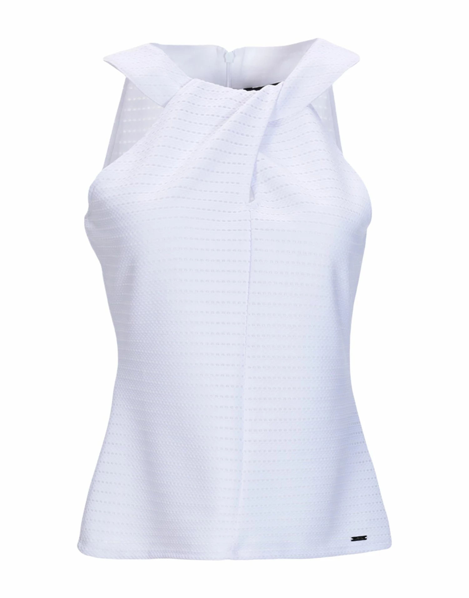 plain weave, logo, basic solid color, round collar, sleeveless, rear closure, zip, no pockets, stretch