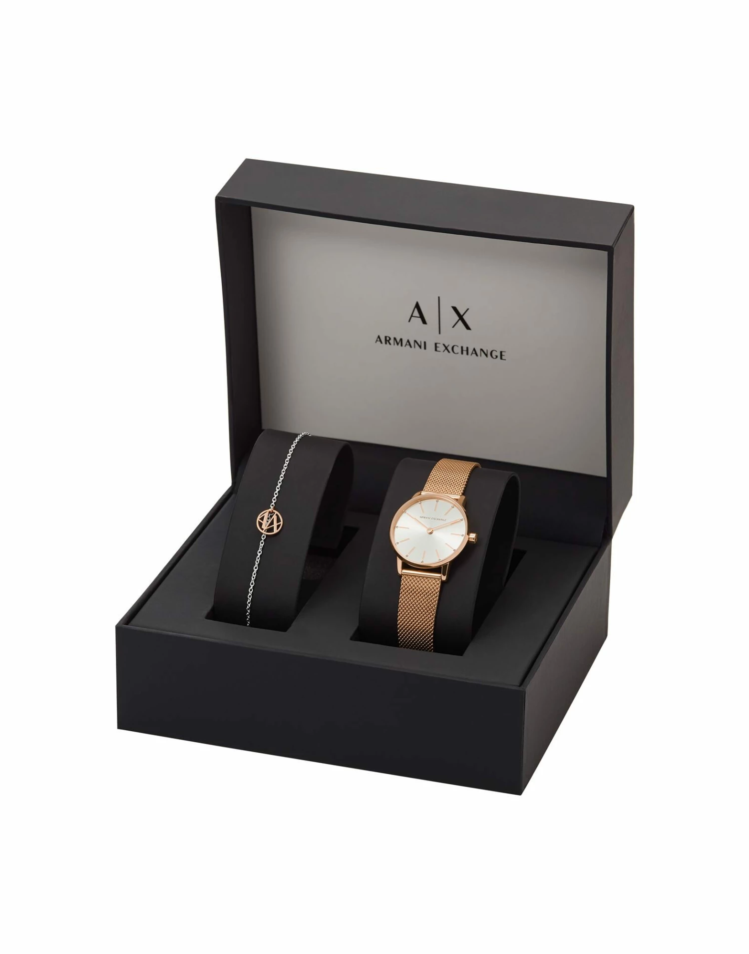 plated, logo, framed closure, strap material: stainless steel, case material: stainless steel, movement: quartz, power supply type: battery operated, water resistant, 2-piece set